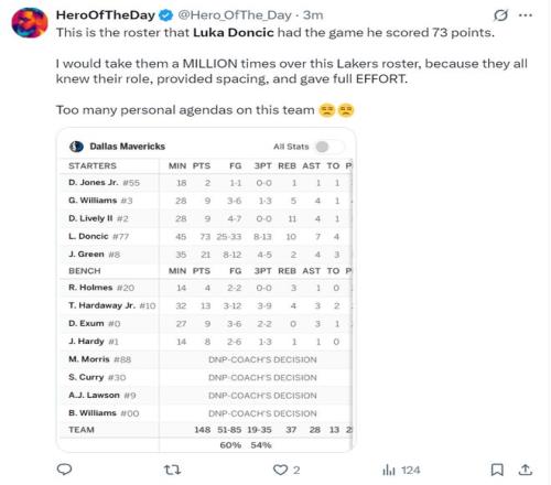 东契奇再度拿到30+5+5的数据已经是湖人队史第三多,赛后斯利普-贝勒斯吐槽东契奇:最后拒绝投空位三分是因为他知道自己三分太差,但为什么没人提及这一点?